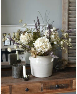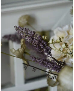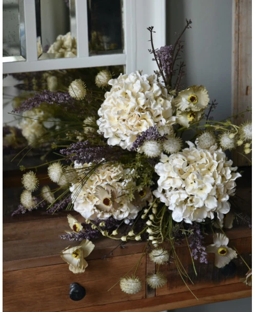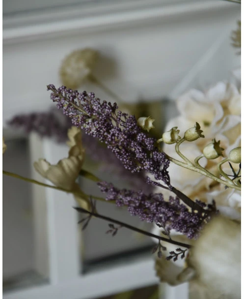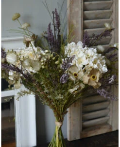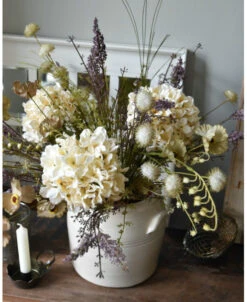 Zijde boeket met Hortensia’s en paars/lila Seringen pluimen. Dit prachtige boeket is in warme tinten crème groen en paars/lila die samen een mooi geheel vormen. Het boeket is opgemaakt met zijde/kunst bloemen die gemengd zijn opgebonden. U kunt het boeket zo op een mooie pot of vaas zetten. In het boeket zit o.a. Hortensia’s, Anemonen, Lelietje der dalen, paarse Seringen en veel soorten groen. Het boeket kan zo op de vaas en naar wens bv nog wijder worden gebogen (doe dit richt het bindpunt voor het mooiste effect.