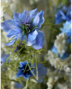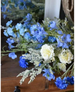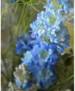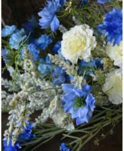 Zijde boeket met tuinbloemen in het blauw wit. Dit prachtige boeket in blauw, wit en groen tinten zit tussen een pluk en veldboeket in. Het boeket is korenschoof gebonden met mooie bloemen als Delphinium/Ridderspoor, Alstilbe, Campanula, Nigella/Juffertje, Anjers en Korenbloemen. U kunt het boeket zo op een mooie vaas/kruik zetten en heel lang genieten van het geheel. Zijde/kunst bloemen kunt u het beste niet in direct zonlicht zetten. Het boeket heeft een maximale lengte van 80 cm en kan uiteraard met een tag op maat worden gekipt of door de onderkant van de stelen te buigen zodat het boeket bij u op de vaas past. Het kan zijn dat wij de onderkant van de stelen buigen voor vervoer.