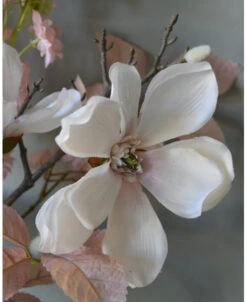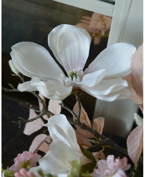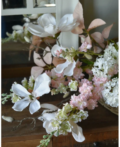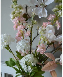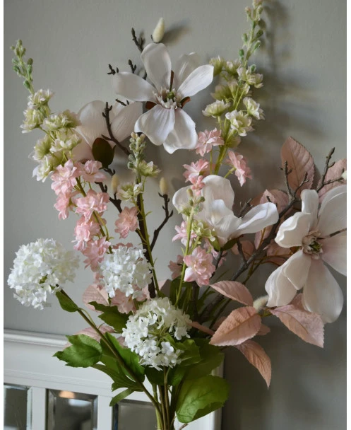 Zijde plukboeket in poeder tinten wit en roze. Dit prachtige plukboeket in poeder tinten roze en wit is eenzijdig opgemaakt en past heel mooi op een hoge fles of pot met smalle hals. Het boeket met lente en zomer bloeiers bestaat uit Magnolia, Delphinium, Sneeuwbal/Viburnum en blad. U kunt het boeket altijd nog korter knippen of de stelen ombuigen op de gewenste lengte en ook zijn de bloemen nog voorzichtig iets te buigen in de gewenste positie. Het kan zijn dat wij de onderkant van de stelen gebogen versturen voor vervoer.