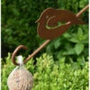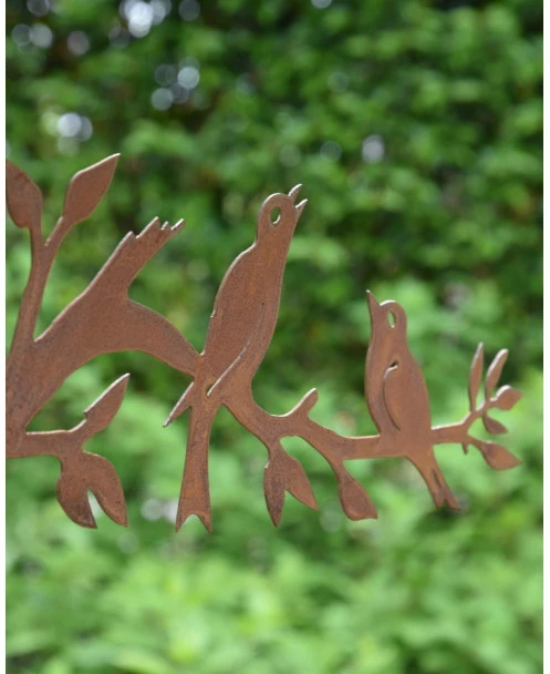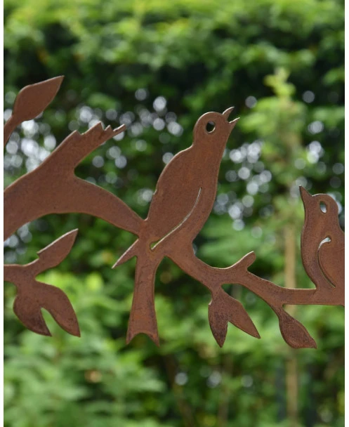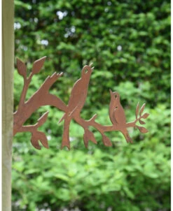 Zingende vogels op bladertak, ecoroest. Op deze leuke sierlijke tak met bladeren zitten twee vogels waarvan er een zingt. De silhouet tak is van metaal gemaakt die door een speciale behandeling een mooie roestlaag heeft gekregen. De warme natuurlijke uitstraling gaat mooi op in de omgeving en maakt het een mooie blikvanger. Aan de tak zit een schroef waarmee u het geheel aan een boompaal, schutting of houten schuur bv vast kunt zetten en zo te genieten van het vrolijke tafereel.