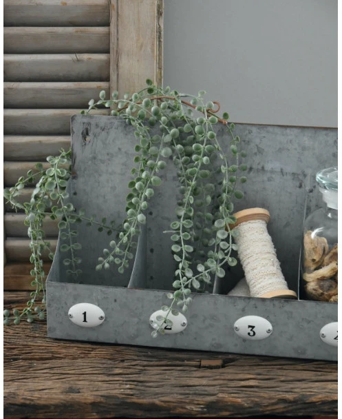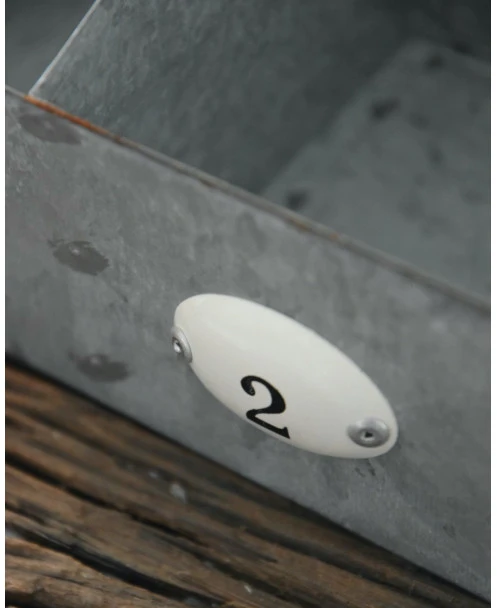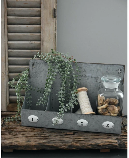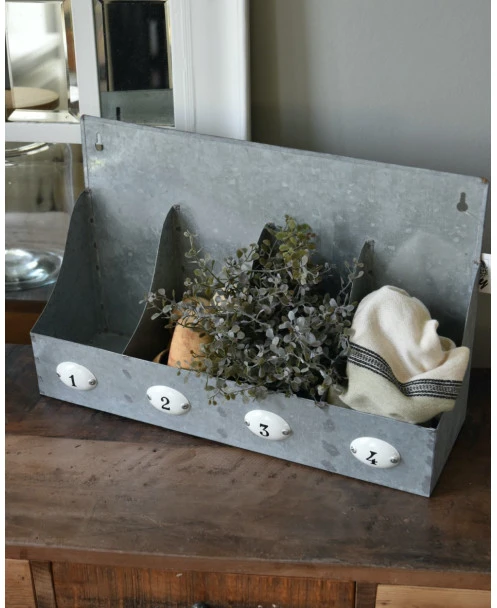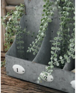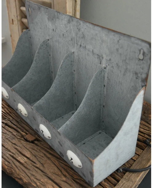 Zinken bak met 1-4 vakken per stuk. Deze leuke bak is van zink gemaakt en heeft 4 vakken naast elkaar die genummerd zijn met ovale bolle witte plaatjes van 1 t/m 4. De bak kan heel mooi gedecoreerd worden met potjes een (kruiden)plantje of functioneel als postvak worden gebruikt. U kunt de bak zowel staand als hangend gebruiken. In de achterzijde zitten aan beide kanten een mooi gat waar u de bak aan kunt hangen (zie foto).