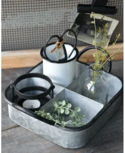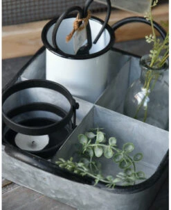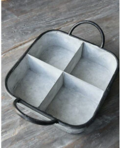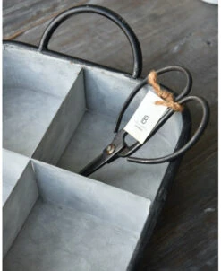 Zinken vakkenbak met zwarte accenten, IB Laursen. Deze leuke bak is een echte duizendpoot, de mogelijkheden om te decoreren en hem te gebruiken is oneindig. De vierkante bak met afgeronde hoeken is van zink met een zwarte rand en twee zwarte handvaten. De bak heeft een viervaks- verdeling waardoor u hem gemakkelijk als opberger voor gereedschap touw e.d kunt gebruiken. Ook is het erg leuk om met mos en plantjes aan de slag te gaan gecombineerd met kaarsjes (ook leuk met de kerst, of de pasen). U kunt er kandelaren en een plantje in plaatsen ………
