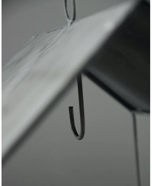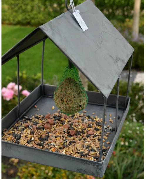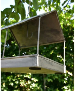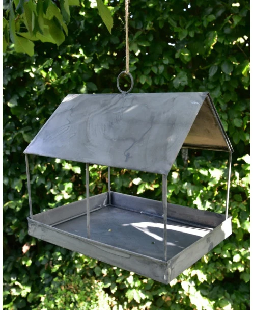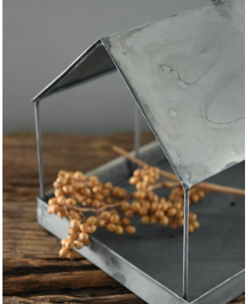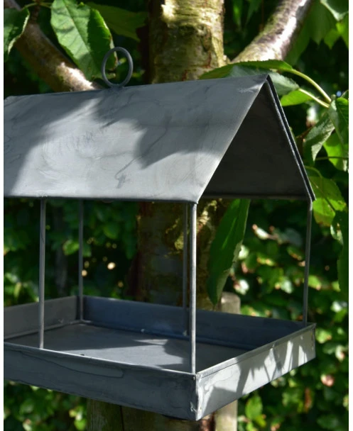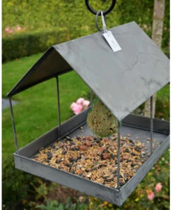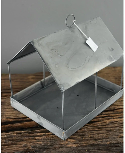 Zinken vogelvoeder huis, IB Laursen. Dit tijdloze zinken vogelvoeder huisje is een rechthoekig model met dak. Aan het dak is een ring bevestigt om het huisje mee op te eventueel hangen, aan de binnen zijde is een haak bevestigd om vetballen of een zakje pinda’s mee op te hangen. Het huisje heeft enkele gaatjes in de bodem zodat het eventuele regenwater er makkelijk uit kan en aan de onderzijde vier vilten zooltjes om het huisje net van de grond te zetten.