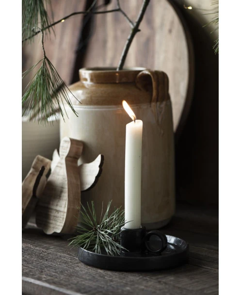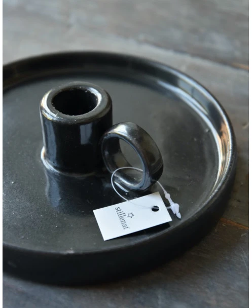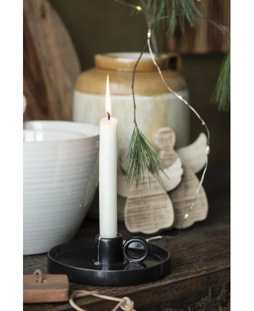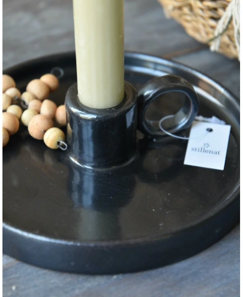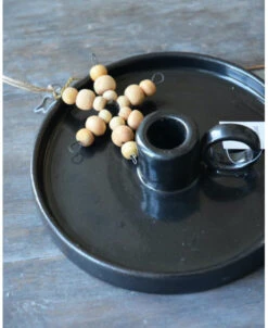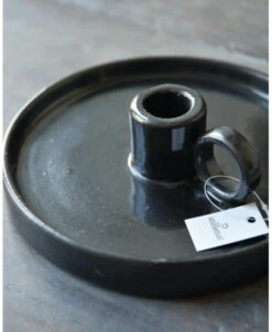 Zwarte aardewerk kandelaar met oor, IB Laursen. Dit vintage model kandelaar is in een aardewerk uitvoering. Het zwart is iets glanzend De platte schotel heeft een kleine opstaande rand met een kaarsen inzet en een rond oor. In de kandelaar past een normale afmeting kaars (2,2 cm in diameter). Zowel de korte als de lange tafelkaarsen passen goed en mooi in deze kandelaar. Zwart is een neutrale ‘kleur’ die goed en gemakkelijk kan worden gecombineerd in bijna iedere woonstijl.